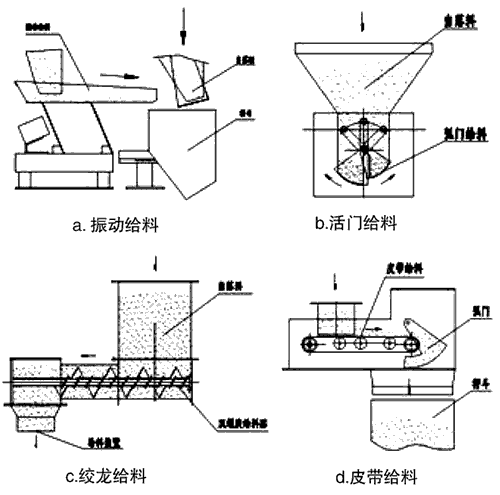 圖1中一部分也可以根據(jù)物料特性相互結(jié)合起來使用,通過在各種給料結(jié)構(gòu)上采取相應(yīng)措施產(chǎn)生符合要求的粗細(xì)給料組合,例如利用振動和活門給料結(jié)合,利用給料槽的不同尺寸,利用絞龍或皮帶電機(jī)的不同速度等!∑渲薪o料裝置結(jié)構(gòu)形式較多,主要有:電磁(電機(jī))振動式、重力(活門或插板)式、螺旋(絞龍)推進(jìn)式、皮帶輸送式、強(qiáng)流給料等。